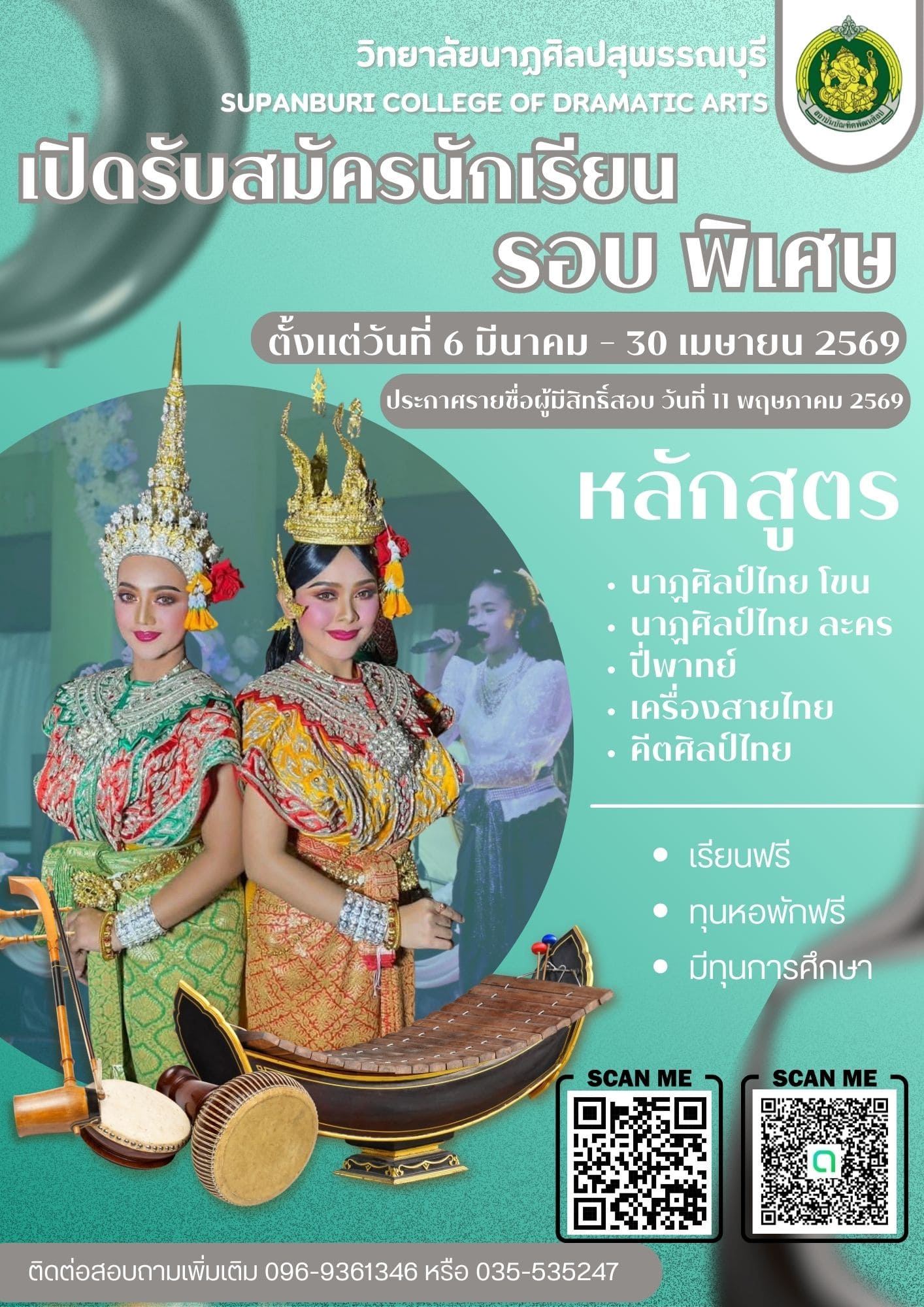 วิทยาลัยนาฏศิลปสุพรรณบุรี เปิดรับสมัครผู้สนใจศึกษาต่อ ระดับมัธยมศึกษาปีที่ 1 และ ประกาศนียบัตรวิชาชี